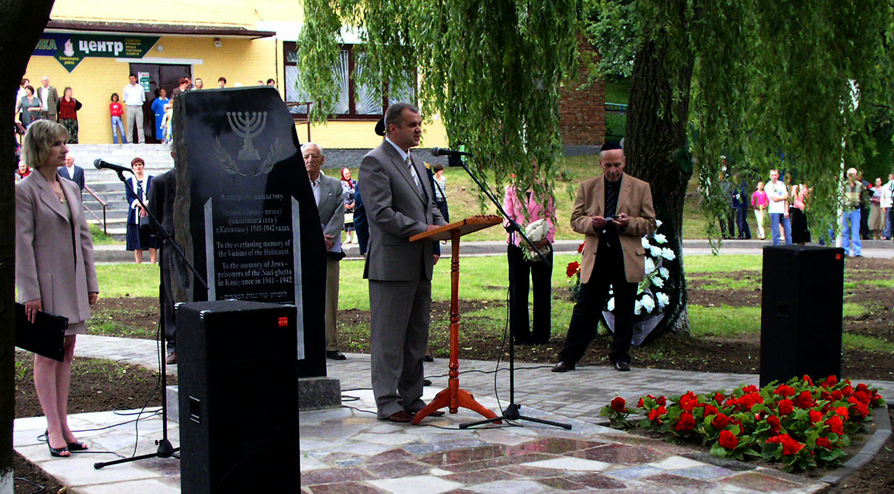 MASS GRAVE: Concerning the mention above of the "site of execution...": in fact, no Jews were killed on the site of the memorial. Most Jews were driven to Wysokie, to be transported in a goods train to Treblinka in 1942. Those who managed to hide, yet later were captured by police, were killed and buried in several places in Kamenets and outside the town. The text in English on the monument reads: "To the everlasting memory of the Victims of the Holocaust. To the memory of Jews - prisoners of the Nazi ghetto in Kamyanec in 1941-1942". More information about the Holocaust and the old three Jewish cemeteries in Kamenets is available in the book, written by a local historian, G. S. Musevich, in Russian: Narod, kotoryi zhyl sredi nas (The People Who Lived Among Us), published in Brest in 2009. Source: Oleg Medvedevsky. [February 2012]