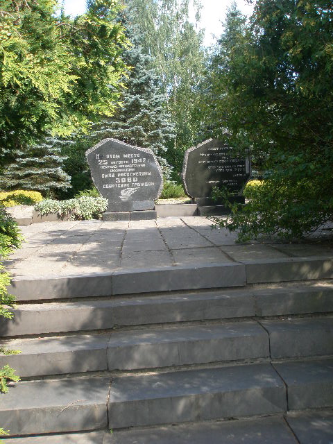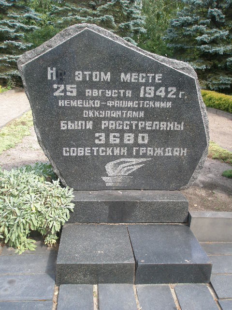 The memorial from Soviet times: "On this place on 25 August 1942 the German-Fascist occupiers shot 3,680 Soviet civilians". Berezno. These "Soviet civilians" were Jews, though no Soviet memorial acknowledged that fact.