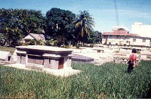 A small Jewish Cemetery on Jalan Zainal Abidan (Street), one block north of Jalan Macalister (Jalan means street in Malay) about 5 blocks northwest of the Komtar Office Building (a landmark impossible to miss in Georgetown). Interestingly, on the city map, the street is named Jalan Yehudi, but there was no apparent sign of that name on the streets or business addresses. I counted 106 graves (my guide said there were 104 and perhaps he was correct). Six are somewhat segregated. He said they were soldiers' graves (the inscription on at least one confirmed this). The inscriptions on about half of the markers are present and readable, some in Hebrew, and some in English. Most graves have full concrete covers over them. Some are quite elaborate structures. Some of the older ones are crumbling, but most are in good shape. Source: This email address is being protected from spambots. You need JavaScript enabled to view it., [March 13, 1997]