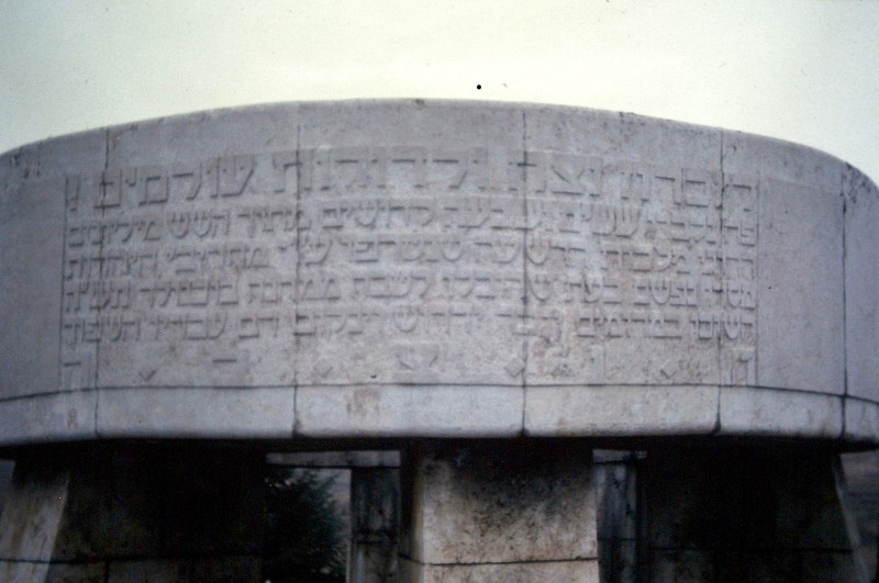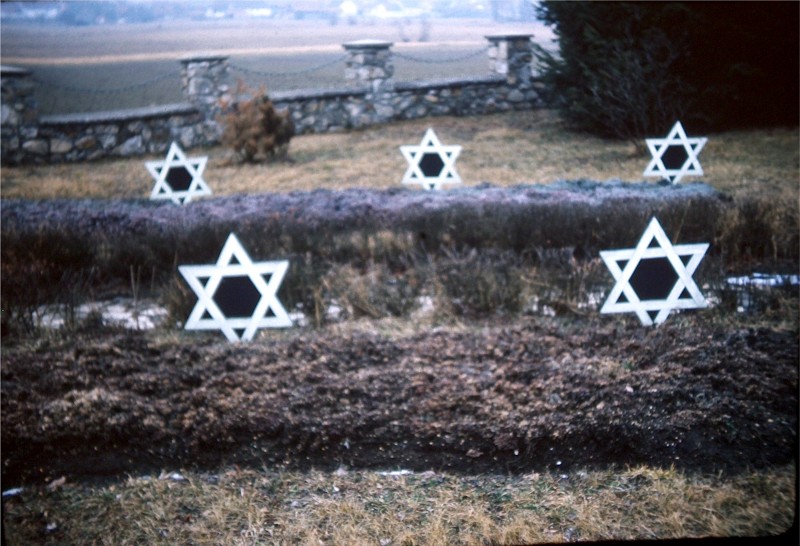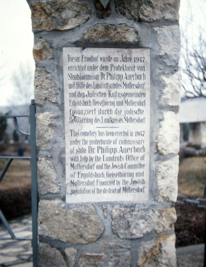 photo. It was built and funded by Dr. Philip Auerbach. A memorial plaque on either side of the gate is in German and Hebrew. photo. Post WWII photo of delegation Regensburg Jewish community at the unveiling of the memorial. [May 2011]
